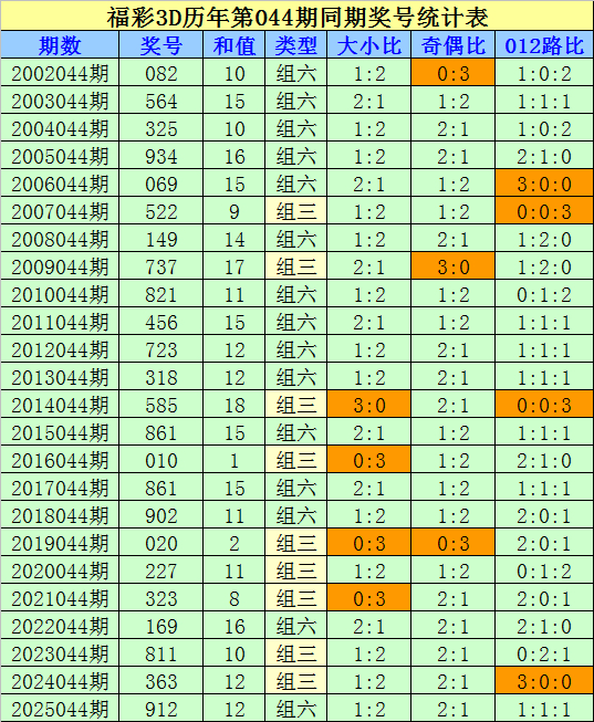 奇偶比推选:在第044期历史同时开奖中,奇偶比3:0开出1次,奇偶比0:3开出2次,奇偶比1:2开出10次,奇偶比2:1开出11次,奇偶奖号总个数比35:37,偶数号码相对占优,本年同时看好偶数号码无间热出,情切全偶组合。