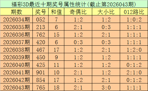 开奖转头:第2026043期福彩3D奖号为765。奖号方式为组六,大小比为3:0,和值为18,奇偶比为2:1,012路比为1:1:1,跨度为2。
