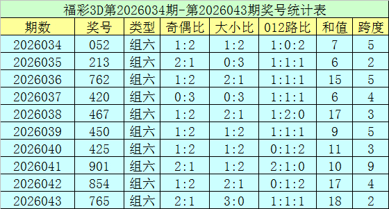 上期纪念:福彩3D第2026043期开奖号码为765,组选类型为组六,奇偶比为2:1,大小比为3:0。