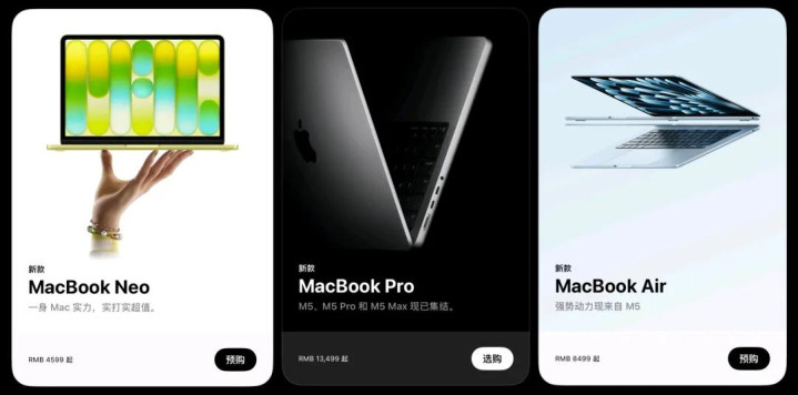 上周,苹果进行了一轮密集的春季新品发布,共上架7款新品,其中包括了3款新MacBook:M5 Pro/Max MacBook Pro、M5 MacBook Air以及MacBook Neo。
