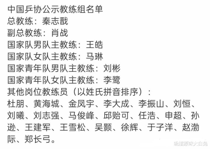 国乒选教练,持续了一段时间,现在名单公布了。王励勤还是以维稳为主,维持了上一个奥运周期的框架。其实总教练、副总教练、男、女队主教练,符合这些竞聘条件的人本来就不多。秦志戬、肖战、王皓编制都是在北京先农坛。现在来看,王励勤属于四平八稳的风格,勤于政事,但没有刘国梁的天马行空的奇思妙招,刘国梁属于战略性的帅才。