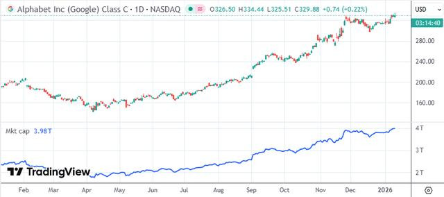 2025年,谷歌录得自2009年以来表现最好的一年,并在上周超越苹果成为全球第二最具价值的上市公司,仅次于英伟达。