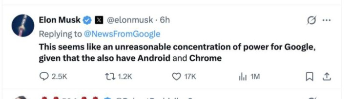 “考虑到谷歌已经控制了Android和Chrome,这样的合作将导致不合理的权力集中。”马斯克在X上写道。