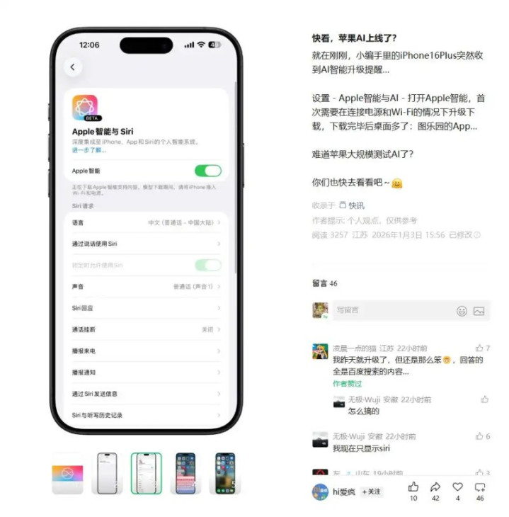 {jz:field.toptypename/}在苹果AI宣布大进展的同时,国内用户也在等待苹果AI国行版的上线。就在本月,有博主发文称,其国行版iPhone16Plus收到了“Apple智能与Siri”相关测试提示,随后“苹果国行AI灰测”话题迅速引发网友热议。