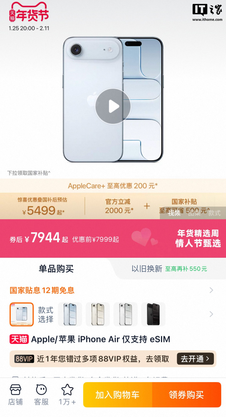 IT之家1月23日消息,苹果AppleStore天猫旗舰店显示,苹果iPhoneAir手机将于“天猫年货节(1月25日20:00至2月11日)”期间进行促销,该机国行原价7999元起,活动期间可领2000元券,叠加部分地区500元国补后,开云app在线下载入口到手价低至5499元(IT之家注:限量13000台)。