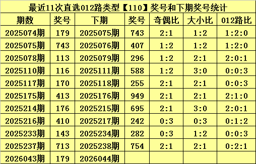 陈设三上期开出奖号为:179,其直选012路类型为110,历史上直选110号码已开出了264次,最近11期差异开出奖号为:179、743、113、116、170、413、176、410、143、713、179。