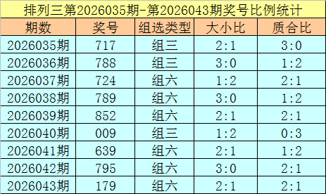 上期回归:陈设三第2026043奖号开出179,奖号质合比为2:1,大小比为2:1,跨度为8,类型为组六。