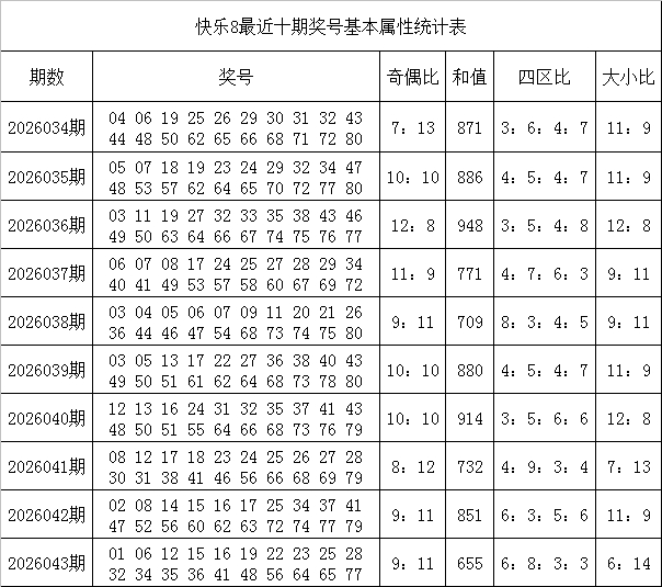 福彩适意8第2026043期开出奖号:01 06 12 15 16 19 22 23 25 28 32 34 35 36 41 48 56 64 65 77,其中奖号奇偶比为9:11,和值为655,跨度76,四区比为6:8:3:3。