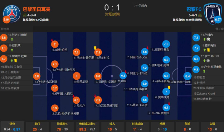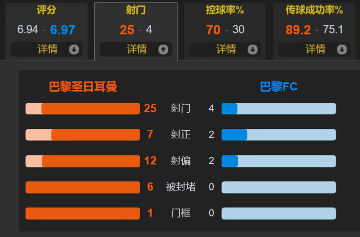 比赛数据来看,巴黎的控球率为七成,狂射25脚,也有7次射正,但哑火了;反之巴黎FC4射2正打入1球,是经典的以弱胜强!对此球迷调侃,你有没有发现,大巴黎每一个赛季都会输掉一些莫名其妙的比赛,让你感到匪夷所思的失利,或许这就很“大巴黎”,老球迷已经见怪不怪。