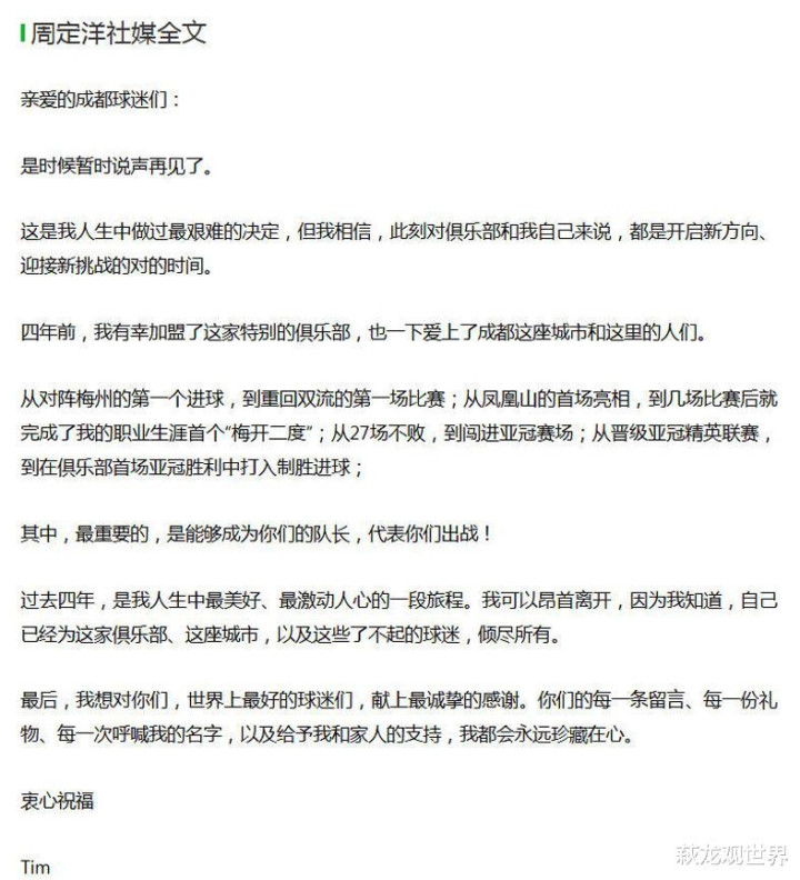 周定洋说, 这是自己人生中做过最艰难的决定,此刻对俱乐部和自己都是开启新方向、迎接新挑战的对的时间。过去四年,是他人生中最美好、最激动人心的一段旅程。他可以昂首离开,因为自己已经为这家俱乐部、这座城市,以及这些了不起的球迷,mg试玩倾尽所有。最后感谢了成都球迷。