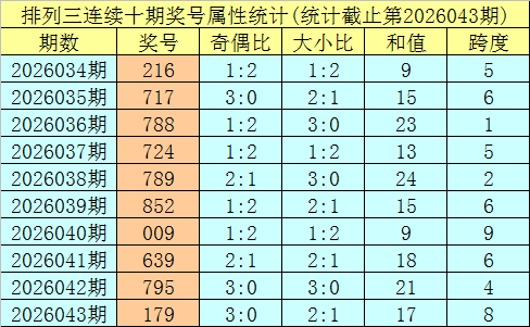 上期追思:陈列三第2026043期奖号:179。类型:组六,奇偶神情:奇奇奇,大小神情:小大大,和值:17,跨度:8。