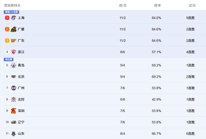 本轮比赛过后,浙江男篮成功杀进前四;遭遇两连败的北京男篮排名第六,辽宁男篮位列第十。