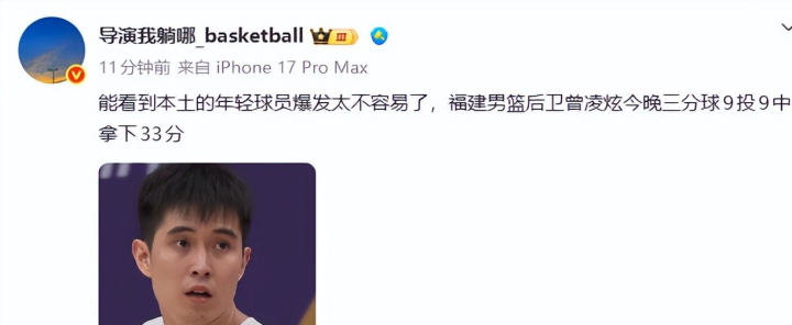 “导演,我躺哪”直接表扬了福建男篮的后卫曾凌炫。确实,本场比赛曾凌炫发挥得极为出色,全场三分球9投9中,以百分之百的命中率砍下33分。个人认为,mg游戏app张庆鹏教练本该安排专人重点盯防他,毕竟上半场他的手感就已经十分火热,可下半场依旧没能遏制住他的进攻势头。