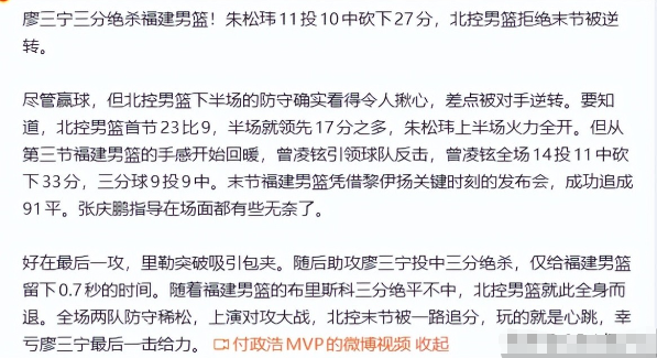 北京时间1月12号,廖三宁投中绝杀三分,北控队以94:91战胜福建队。赛后,各界媒体与专家纷纷发表评论,让人意想不到的是,曾令旭老师夸赞的却是另一位球员。下面让我们看看媒体们的观点: