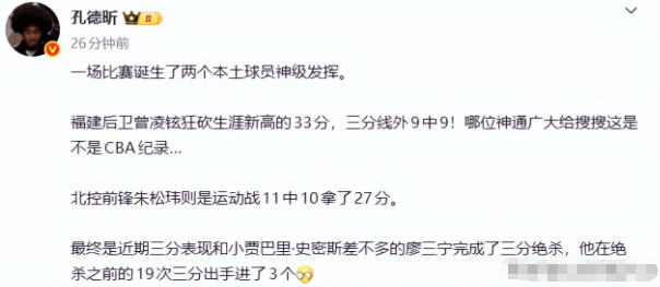 孔德昕道出了本场比赛的关键:有两位本土球员的表现格外亮眼。正如他所说,一位是福建队的后卫曾凌炫,另一位则是北控男篮的朱松玮。在第四节福建队追平比分的关键时刻,朱松玮连续投中两记三分球,直接遏制了福建队的反扑势头。全场比赛,朱松玮运动战11投10中,拿下27分。我们不能只看到廖三宁的绝杀,朱松玮的27分对北控男篮而言,同样至关重要。