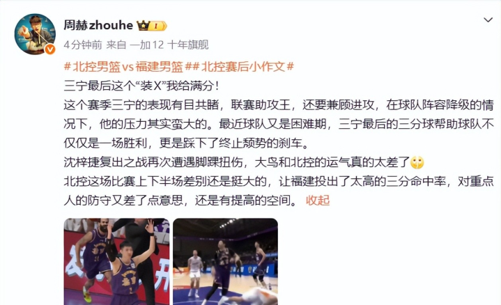 付政浩直接复盘了本场比赛的进程:开局阶段,北控队一直处于领先状态;但随着沈梓捷受伤,第三节北控队的防守突然断电,单节让福建队三分球9投7中,轰下29分;到了第四节,福建队又得到31分,其全场91分中有60分来自下半场。不得不说,沈梓捷的受伤离场,对北控队的防守体系造成了巨大影响。