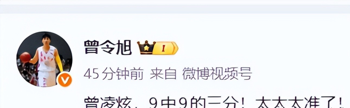 曾令旭老师第一时间发表了评论,他感慨道:“曾令炫三分球9投9中,太准了!”