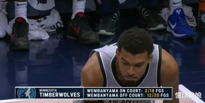 第二节的时候,现场导播给出的数据是,今天文班在场的时候,森林狼18投仅2中,而当文班下场的时候,森林狼是20投12中。
