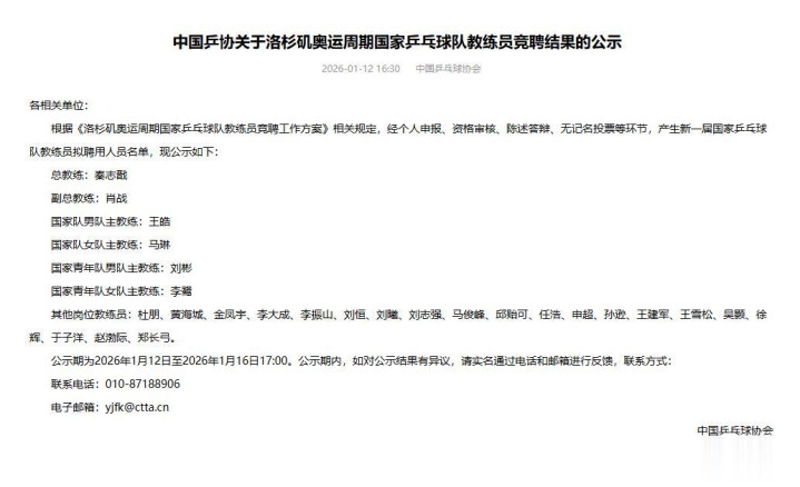 就在今天,中国乒协也是在官网公布了,最新一期教练组的竞聘结果,这次的教练竞聘也是国乒历年中,竞争最激烈的一次,43位教练员竞争28个岗位,虽然有一些岗位的要求非常高,但教练员的条件设置还是非常友好的,这也让更多的教练员,有机会在国乒的舞台上,展示自己的能力!