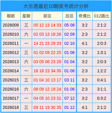 开奖回来:第2026018期大乐透开奖号码为:09、11、19、30、35+01、12。奇偶比为4:1,012路比为2:1:2。