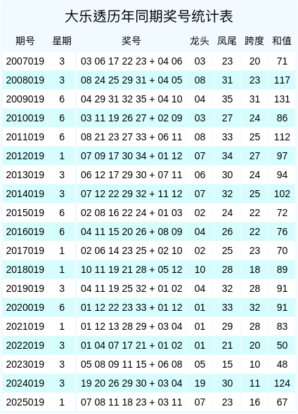 跨度信息:在积年同时数据中,开出的跨度大小比为15:4,奇偶比为7:12。旧年同时奖号跨度为16,本期掂量跨度会在30隔邻开出。
