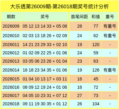 上期前区和值为104,无重号,无连号,首尾间距为26。