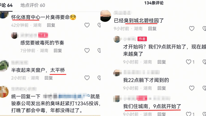 潮新闻记者注意到,从1月12日晚上8点左右开始,就有湖南怀化网友陆续开始在网上吐槽空气臭的问题,这些网友分散在怀化主城区不同区域,但均表示受到空气中臭味的影响。有网友称闻着像农药味,有的网友则表示像臭鸡蛋味。