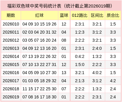 红球三区比2:3:1,质合比为2:4,012路比为2:2:2,蓝球为质数、1路号码。