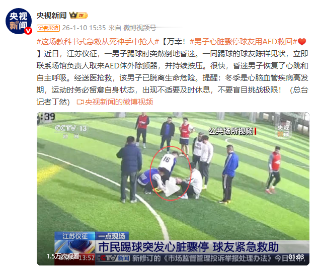 近日,江苏仪征,一男子踢球时突然倒地昏迷。一同踢球的球友陈祥见状,立即联系场馆负责人取来AED体外除颤器,并持续按压。很快,mg试玩昏迷男子恢复了心跳和自主呼吸。经送医抢救,该男子已脱离生命危险。提醒:冬季是心脑血管疾病高发期,运动时务必留意自身状态,出现不适要及时休息,不要盲目挑战极限!(总台记者丁然)